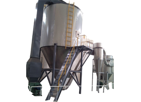 空氣經過濾和加熱,進入干燥器頂部空氣分配器,熱空氣呈螺旋狀均勻地進入干燥室。料液經塔體頂部的高速離心霧化器,(旋轉)噴霧成極細微的霧狀液珠,與熱空氣并流接觸在極短的時間內可干燥為成品。成品連續地由干燥塔底部和旋風分離器中輸出,廢氣由風機排空。
